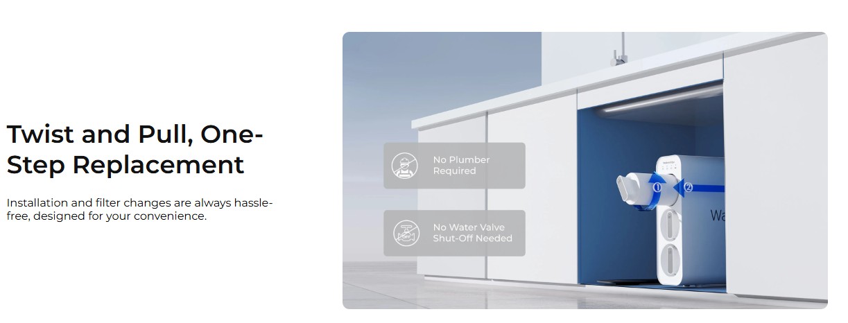 • Simple filter installation and replacement without the need for a plumber